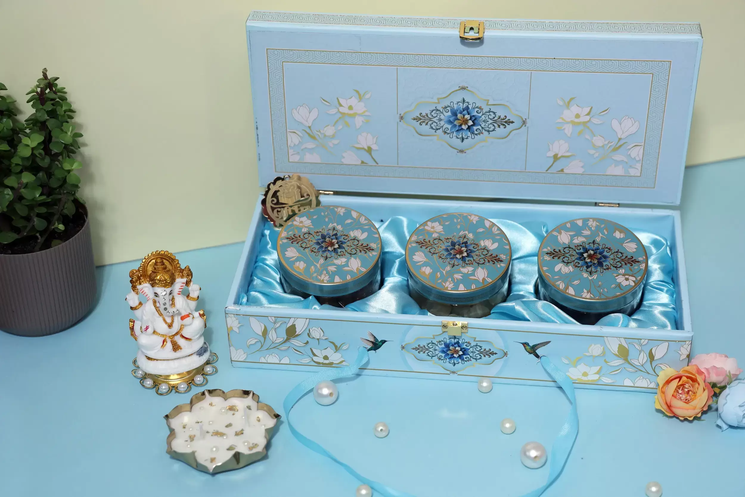 • A graceful sky-blue box with floral motifs, perfect for elegant gifting.