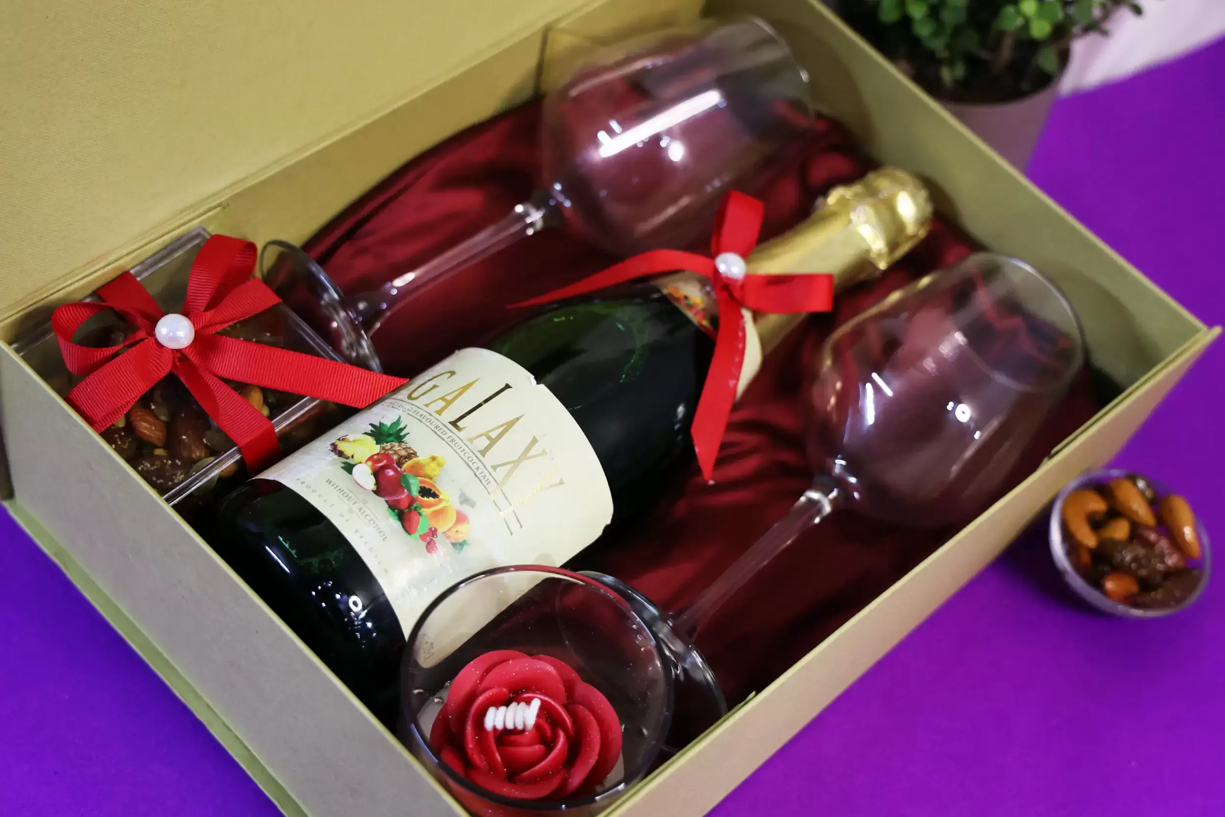 • Includes a wine set with glasses, paired with gourmet treats.