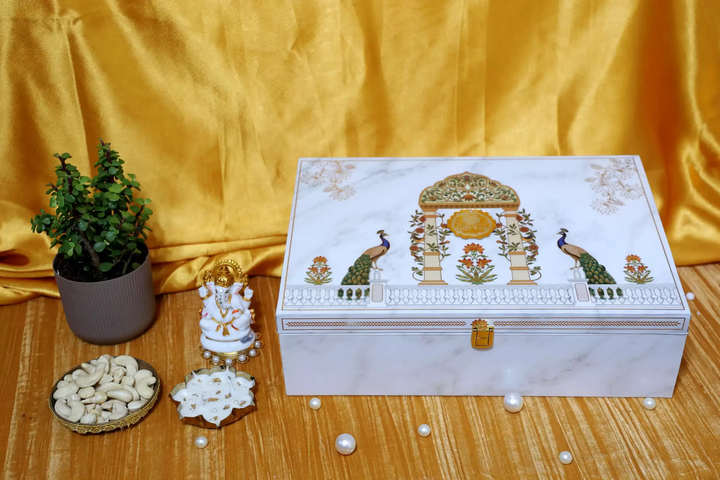 • A stunning white marblefinish box that reflects sophistication and grandeur.