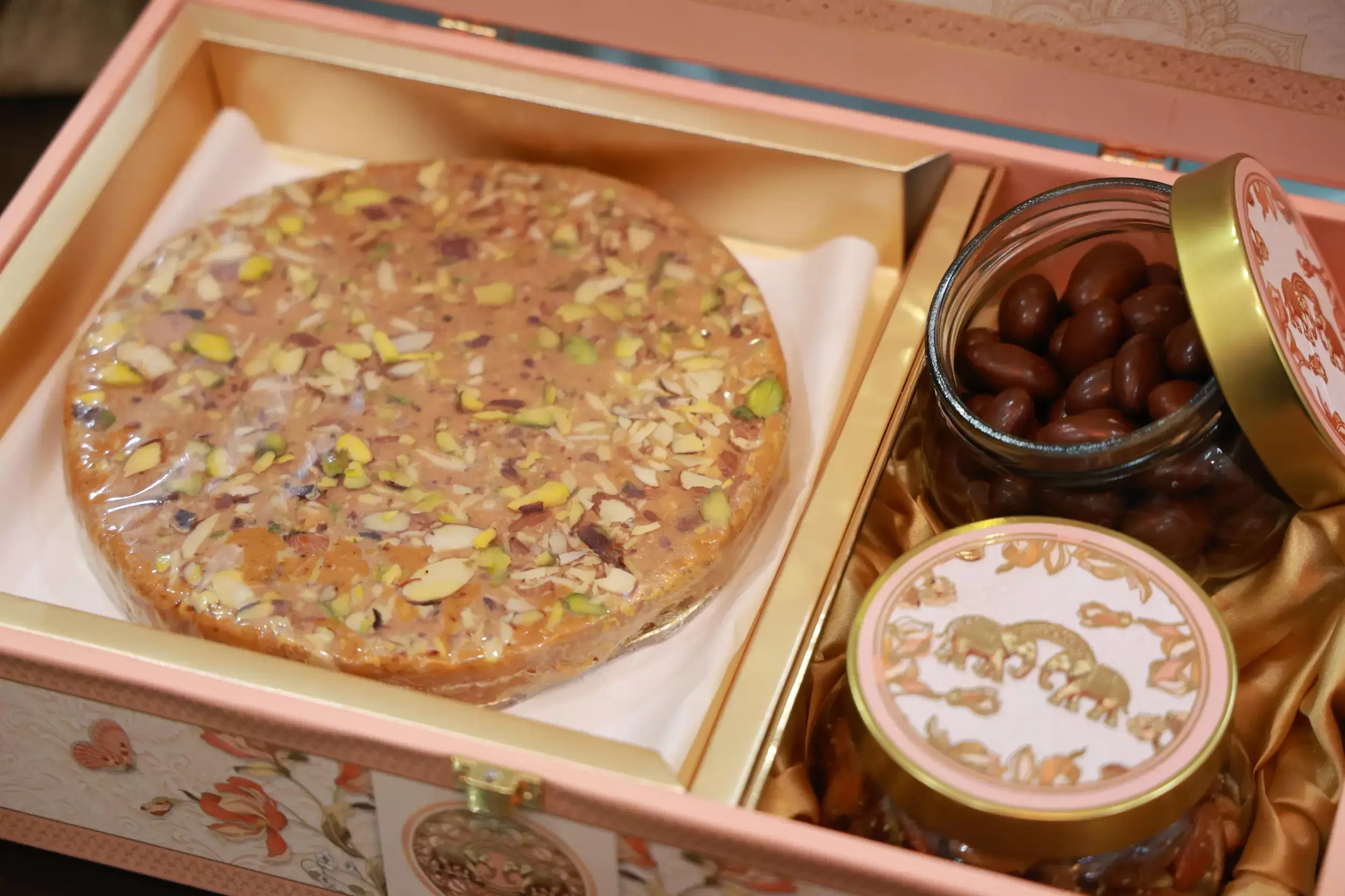 • A sophisticated peachgolden box curated with indulgent sweets and nuts.