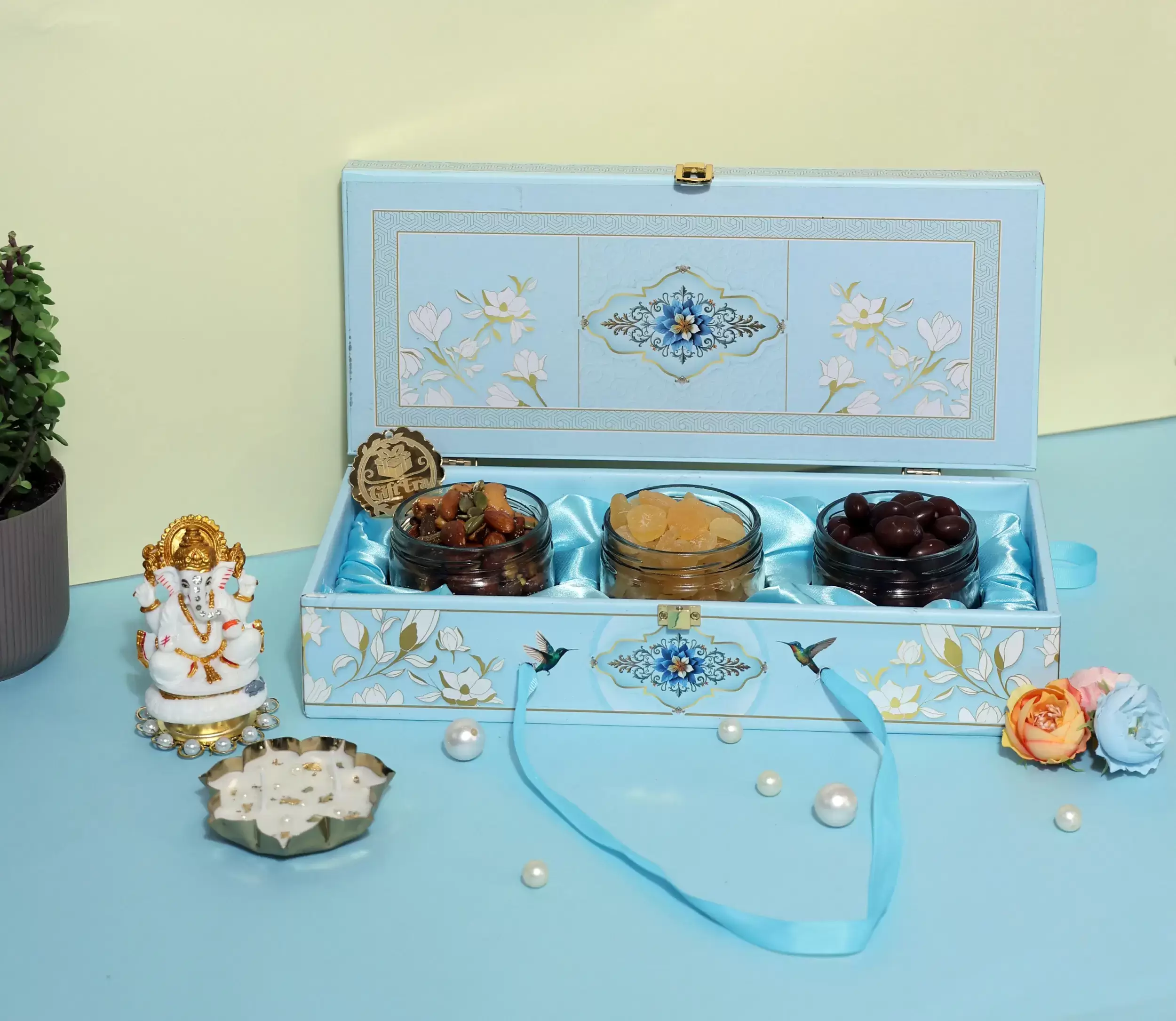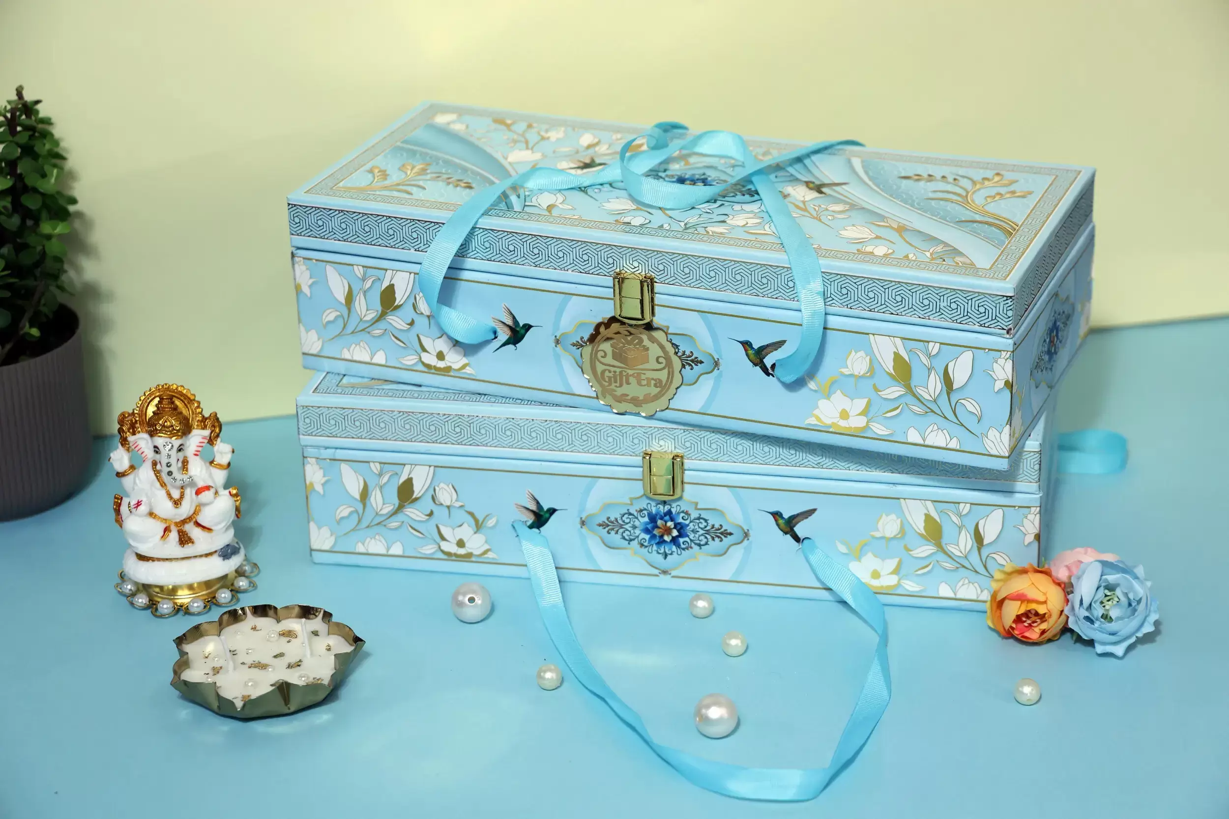 • A graceful sky-blue box with floral motifs, perfect for elegant gifting.
