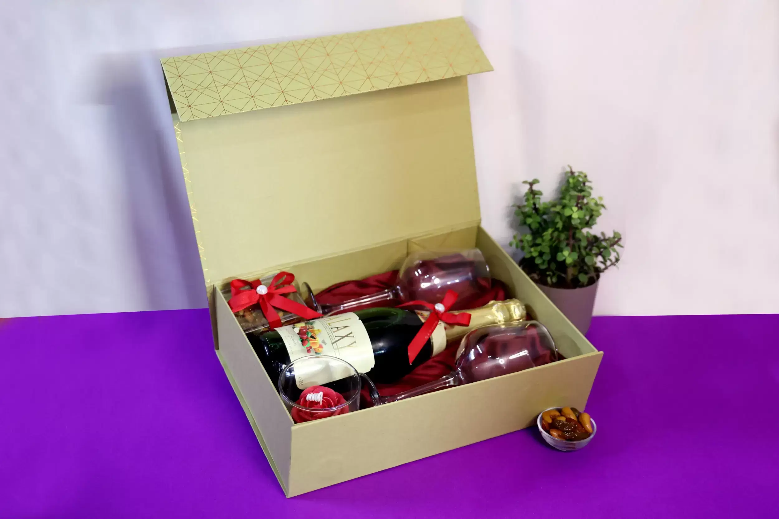 • Includes a wine set with glasses, paired with gourmet treats.