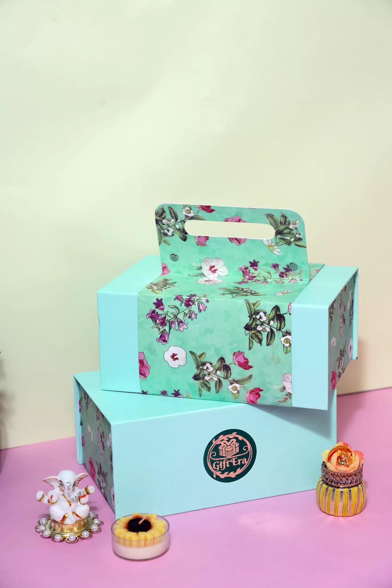 • A charming floral box that beautifully combines elegance with gourmet delights.
