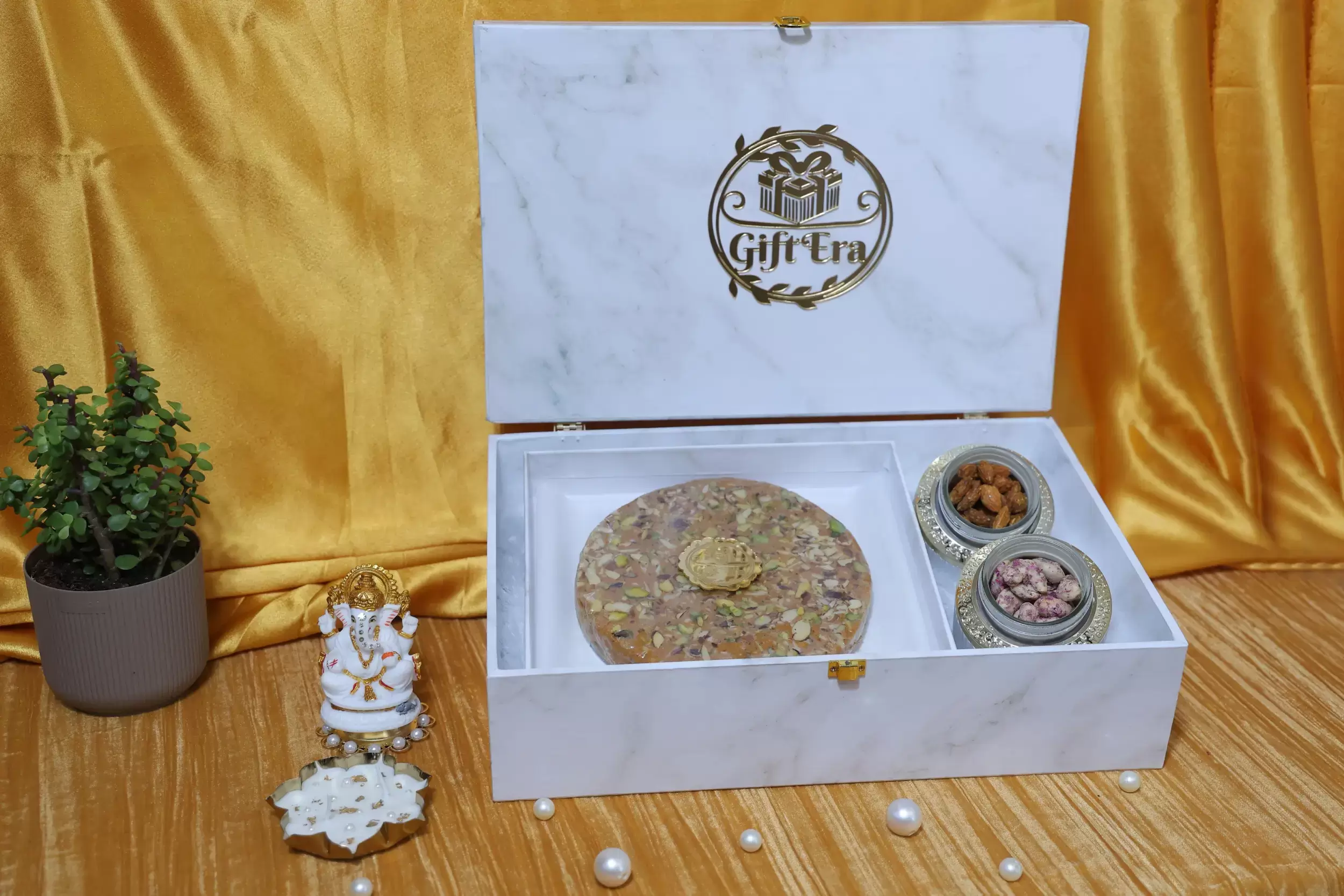 • A premium white marblefinish box designed for luxury gifting.